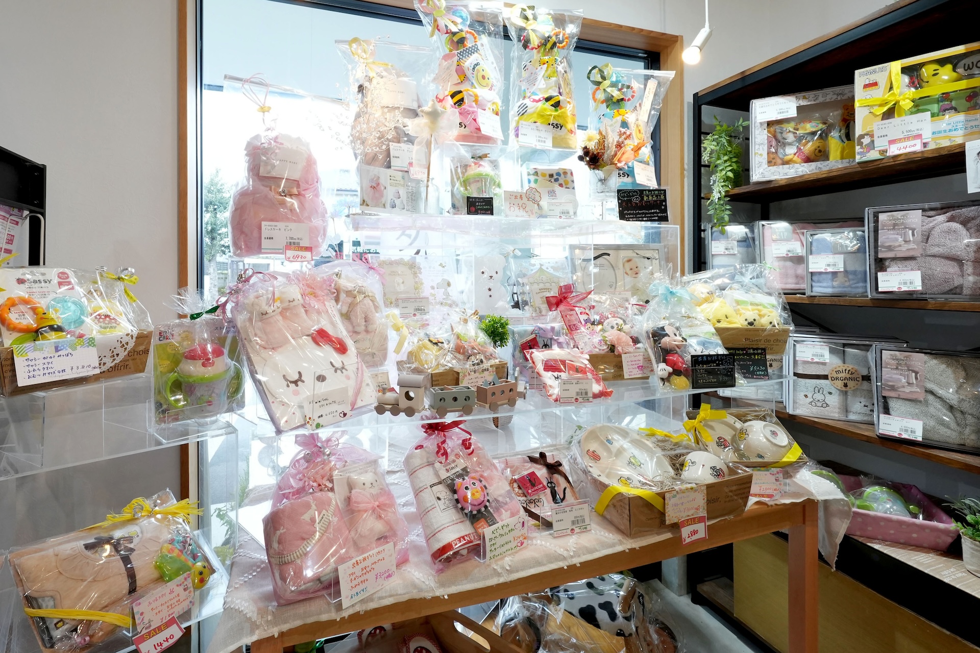 当店のオリジナル雑貨からかわいいプレゼント商品を多数店内にご用意しております。人気の出産のお祝いに!おむつやケーキも多数ご用意しております。